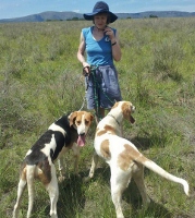 Because of the need for tracking dogs suitable for our extremely hot climate we have trained foxhound x bluetick puppies, and bred one litter of them. They are absolutely the best suited tracking dogs for our climate, being able to work energetically for very many hours in the severe heat. Our Olderhills track just as well as them, but can't last for very long in extreme heat before needing to be given cold water to drink and to be wet with ice water and preferably submerged in water.